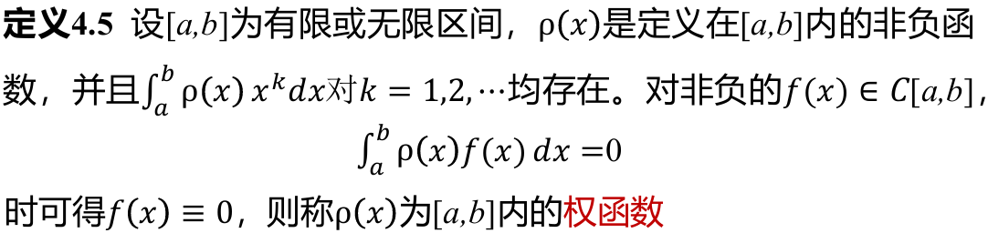 $$ (f,g)=\begin{cases} \displaystyle\int_a^b\rho(x)f(x)g(x)dx&,\text{连续区间}\ \displaystyle\sum^m_{i=0}\omega_if(x_i)g(x_i)&,\text{离散节点} \end{cases} $$