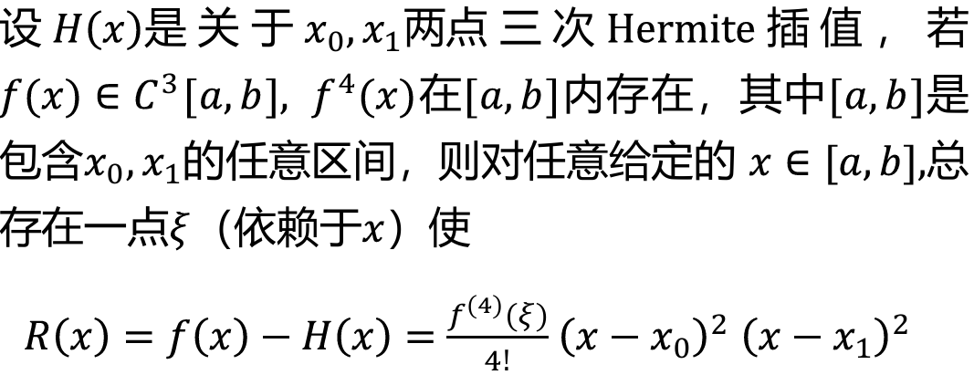 求解: $$ \begin{aligned} h_0(x)=\left(1+2\frac{x-x_0}{x_1-x_0}\right)\left(\frac{x-x_1}{x_0-x_1}\right)^2 \ h_1(x)=\left(1+2\frac{x-x_1}{x_0-x_1}\right)\left(\frac{x-x_0}{x_1-x_0}\right)^2 \ H_0(x)=(x-x_0)\left(\frac{x-x_1}{x_0-x_1}\right)^2 \ H_1(x)=(x-x_1)\left(\frac{x-x_0}{x_1-x_0}\right)^2 \end{aligned} $$
