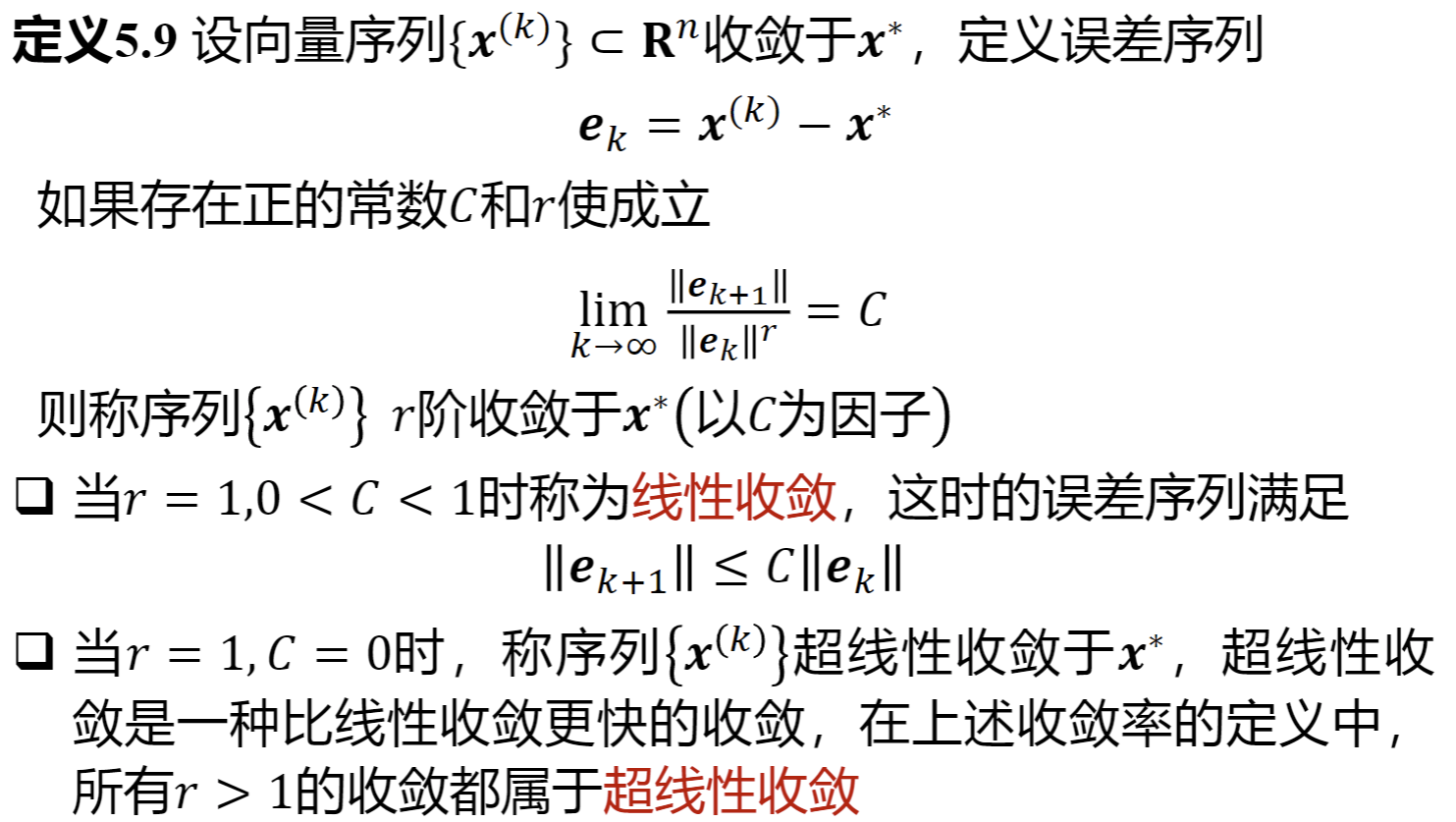 可行解、等式约束、不等式约束、整体最优解/严格整体最优解、局部最优解/严格局部最优解、一阶/二阶必要条件、二阶充分条件、凸最优性定理、(严格)局部/全局极小点、下降方向、局部收敛算法、全局收敛算法、收敛速度。